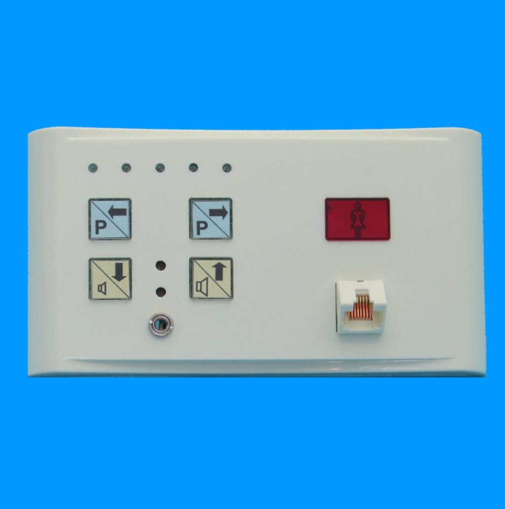 1 Schwesteruftaste, rot 14 x 21 mm, für Patientenruf mit Symbol und roter LED-Beruhigungsanzeige 1 Steckdose RJ45/8, zum wahlweisen Anschluss von Birntastern und Mehrfachbirntastern zur Auslösung von Patientenrufen 1 Steuerelektronik zur Auslösung eines Steckerrufes, wenn ein Anschlusskabel aus der Steckvorrichtung herausgezogen wird 1 Programmwahlschalter ELA für 5 Kanäle mit LED-Kanalanzeige 1 Lautstärketaste + 1 Lautstärketaste - 1 Klinkenbuchse, 3,5 mm für Kopfhöreranschluß Anschlüsse: Anschlussklemmen für den 2-Draht Zimmerbus, 2 Lichtsteuerungen und 5 ELA-Kanäle