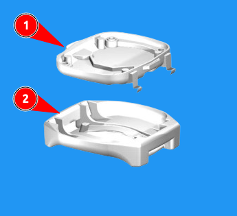 Das Bewohner-Ersatzgehäuse-Set 2-teilig, bestehend aus Basisteil (2) und Gehäuse-Unterteil (1) des Transponders ermöglicht den Austausch oder die Reparatur des Gehäuses eines iGUARD Transponders für Bewohner. Das Set enthält die Hauptkomponenten, die für das Zusammenbauen eines vollständigen Transpondergehäuses notwendig sind, und ist eine praktische Lösung für die Wartung oder den Austausch beschädigter Transpondergehäuse.